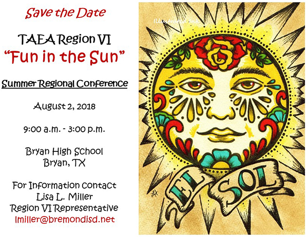 Attendance at the TAEA annual fall conference and the regional conference provide opportunities to make connections across our vast state. Friendships forged at those events can last for years, indeed, perhaps for a lifetime. One of my main goals as the Region VI Representative will be to offer cutting edge workshops at the annual summer Regional Conference and strive to create the type of nurturing and innovative environment that recharges and refreshes our membership. This is a crucial service, as we all know just how stressful and draining our profession can be over the long haul. Please feel free to contact me and provide input into how best I can provide services to the members of TAEA Region VI.