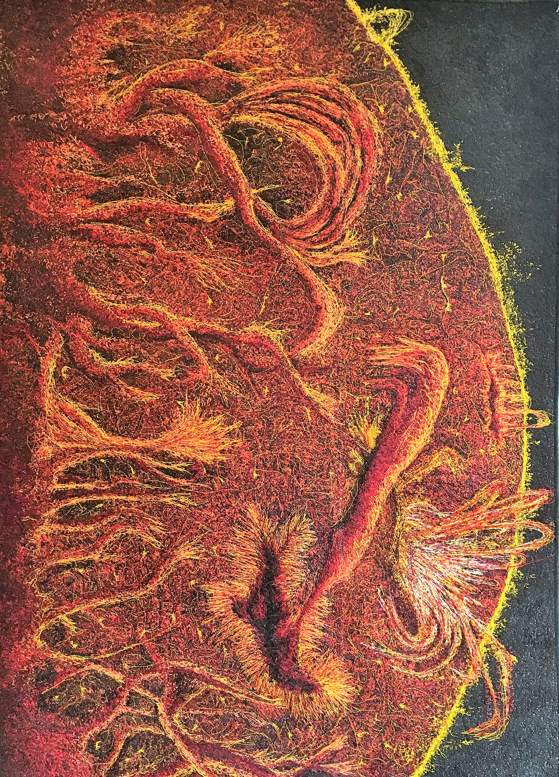 Hand sewn embroidery and a glass fusion frame