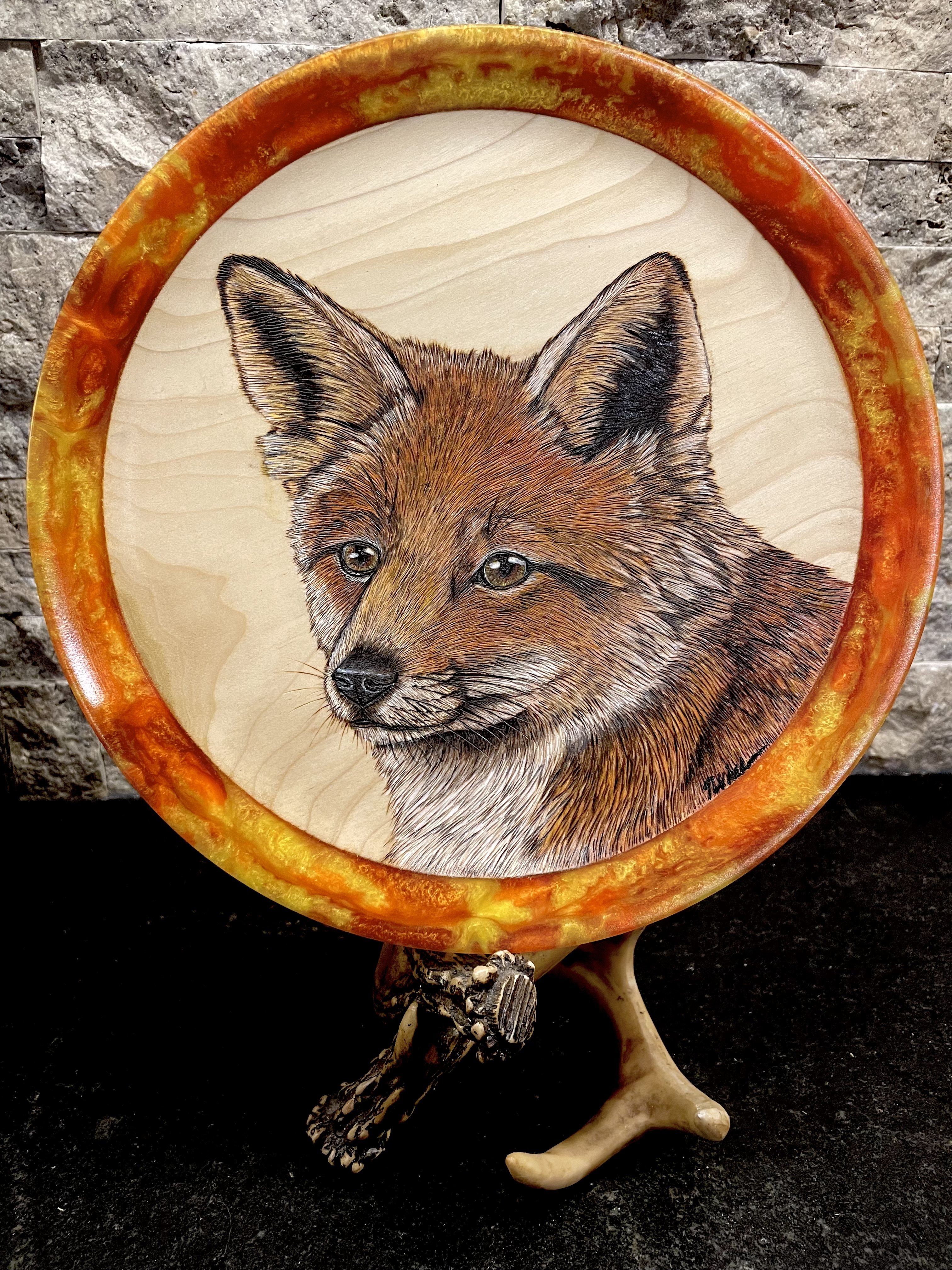 Wood Turning, resin, wood burning, and colored pencils
