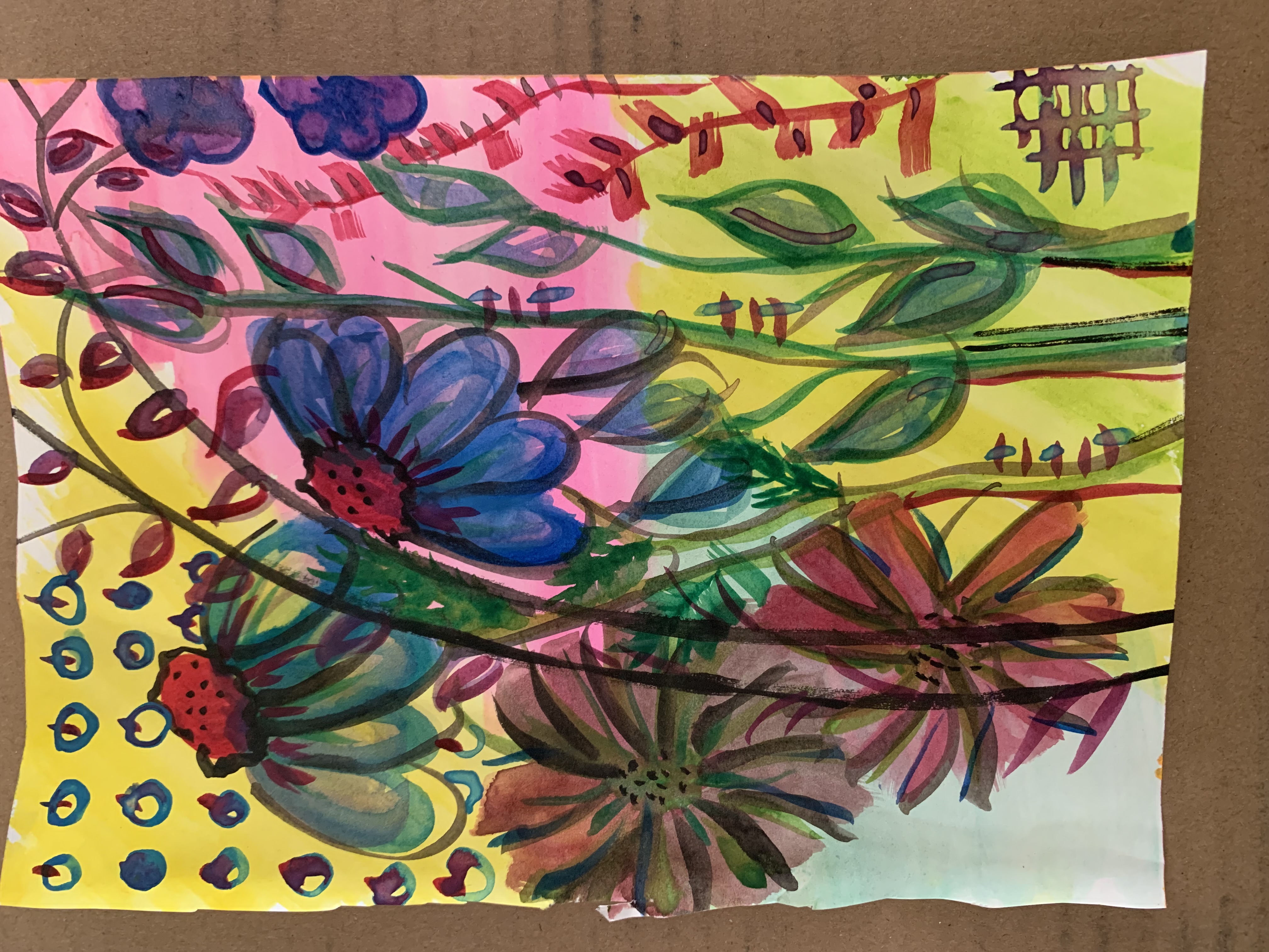 Watercolor, watersoluble wax pastel, Tombow marker, pen & transparency on paper